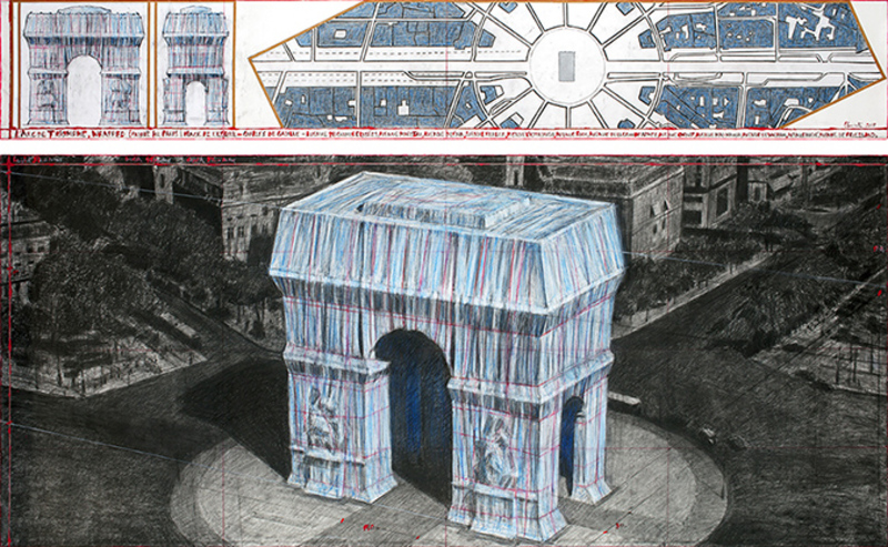 圖一: Christo, L'Arc de Triomphe, Wrapped (Project for Paris) Place de l'Etoile – Charles de Gaulle, Drawing, 2019 in two parts, 15 x 96" and 42 x 96" (38 x 244 cm and 106.6 x 244 cm), Pencil, charcoal, pastel, wax crayon, enamel paint, architectural and topographic survey, hand-drawn map on vellum and tape. Photo: André Grossmann © 2019 Christo