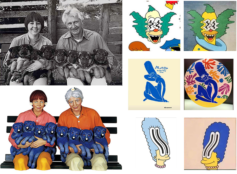 在這樣拋接問題的過程中,你是否已經開始困惑,現今許多作品是不是都已經違反著作權法了呢?舉例來說,《蒙娜麗莎》已經以千百種不同的形式出現在你的生活中,或是眾多古典大師的名畫被加上了新的物件後重新發表,但這些卻都安然無恙,為什麼可以這麼做?那是因為原作的著作權保障時有時效的,著作權只保留到作者死亡後五十年,所以多半都已經逾期了,《蒙娜麗莎》現在屬於全球「共享創意」的一部分。如果是使用著作權保障還未失效的作品呢?首先,如果是取得原作者的同意,基本上是沒問題的,只是有些創作在「轉化」的過程中,可能會對原作有些「不敬」,對方想必是不會同意的。而到底怎麼樣的作法算是「轉化」,而不會「侵權」呢?可以從傑夫.孔斯(Jeff Koons)的案例來看看,孔斯的作品大多都以重新詮釋或重製作表現,他的〈凝視球系列〉就是在大師的複製畫中黏上一顆藍色的玻璃球,當然古典大師的著作權大多都逾期了,所以沒有什麼大問題。但孔斯也會使用當代的作品進行「轉化」,而這樣確實帶來了法律上的糾紛。攝影家阿特.羅傑斯(Art Rogers)就因為孔斯的雕塑作品《一排小狗》,將他告上法院。這件作品取材自羅傑斯的圖像,裡面是一對夫妻並肩而坐抱著八隻剛出生的小狗,孔斯請義大利的製作工匠將八隻小狗依樣做成了彩色的木雕,作品確實承襲了孔斯一貫的「俗艷」的風格,然而法院還是拒絕了他的合理使用的辯詞,因爲法官認為孔斯「做得不夠多」,不足以具有「轉化」的用途。但在二OO六年,孔斯跟攝影師安德莉亞.白蘭琪(Andrea Blanch)的官司中,法院卻認定他已經做得夠多了,具有高度轉化可以算是全新的創作,獲判無罪。而這些關於「轉化」、「挪用」的案件在數位時代的現今更是層出不窮。