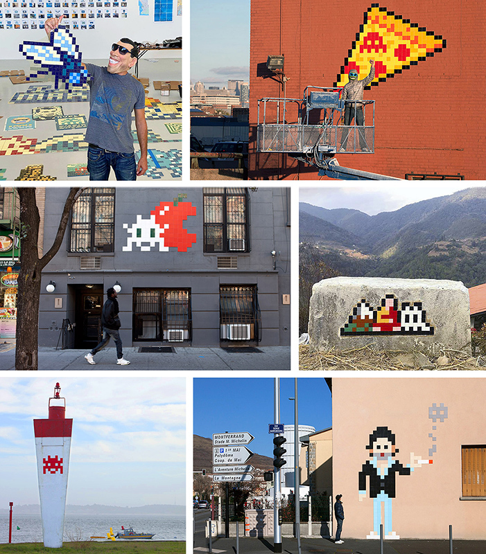 神秘的法國街頭藝術家 Invader,受經典機台遊戲《太空侵略者》(Space Invader)的啟發,來自兒時電子遊戲的靈感,以馬賽克磁磚拼貼,表現出像素風格,也是對數碼世代的一種懷舊詮釋。創作模式運用游擊的手法,將作品置於街頭角落,多年來在世界多處留下超過3,000多個「入侵裝置」,這種挑戰傳統和獨特的創作方式,使他成為全球知名的街頭藝術家之一。