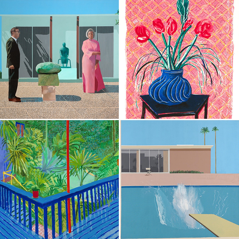 展覽中曾展出的《Portrait of an Artist (Pool with Two Figures》(藝術家肖像(泳池與兩個人像))作為霍克尼最具代表性和名氣的作品,靈感來自於工作室地板上偶然放置的兩張毫不相干的照片,兩方凝視反而產生了奇異令人著迷的美感。畫中描繪了身穿粉色外套的金髮男子上身微傾,靜靜凝視著游泳池內的棕髮男子,背後綿延的遠山,灑落的陽光,勾勒出空氣中瀰漫的張力與荷爾蒙,成為霍克尼最為名留青史的一幅作品。而後這幅畫作在2018年的佳士得拍賣會場以27.3億美元高價售出,霍克尼一舉成為當代身價最高的在世藝術家。
