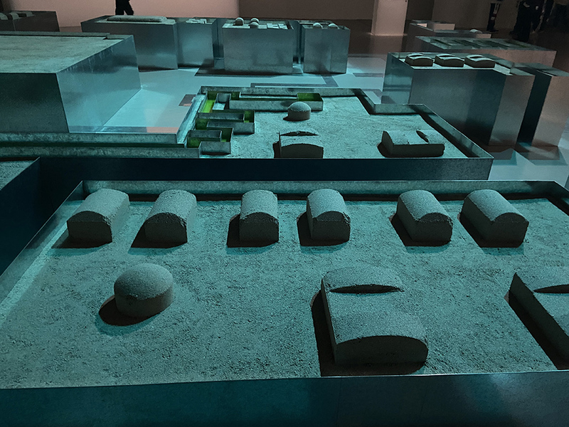 圖一:唐納天,《漫遊微觀宇宙》,2023,複合媒材裝置:工事用砂、鍍鋅鋼板、顏料染色的水