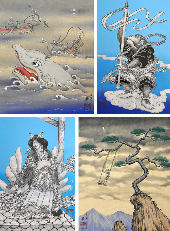 葛飾北齋首創將睡前靈異故事《百物語》題材入畫,也曾為《西遊記》、《水滸傳》作插圖。〈Re- Hokusai〉所描繪五個經典的中國、日本鬼怪角色:鬼、酒吞童子、天狗、孫悟空、妲己,除了致敬葛飾北齋,亦埋有出口雄樹的巧思。出口雄樹靦腆地笑著表示,「妖怪」自古以來便是人們非常感興趣的題材,連小孩子都無法抗拒妖怪的魅力。1960年代的妖怪漫畫《鬼太郎》至今仍十分受觀眾喜愛,為好幾代讀者建立起可愛逗趣的妖怪印象及共同的回憶。出口雄樹也希望藉孫悟空、妲己這兩個中國妖怪消弭與台灣觀眾之間的物理距離,邀請大小孩們一同踏進他揮灑出的妖怪世界,享受這份不分年齡、國界的樂趣。