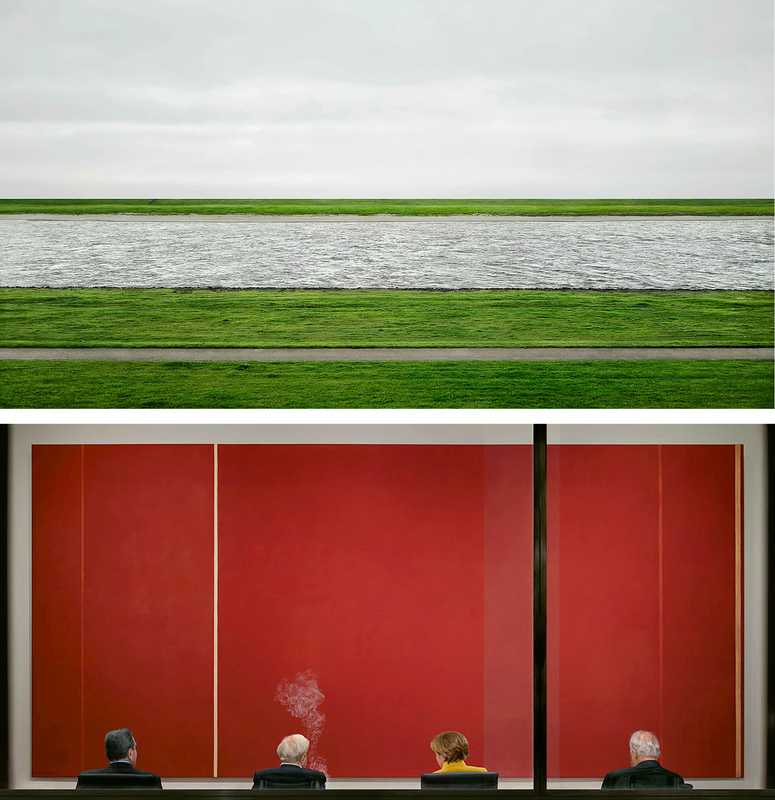 圖二上: 《萊茵河2號》1999, 在2011年以430萬美元價格被拍賣,成為有史以來最高價的攝影作品. C-print mounted to acrylic glass,190 cm × 360 cm, Photograph: Andreas Gursky/DACS/Sprüth Magers.