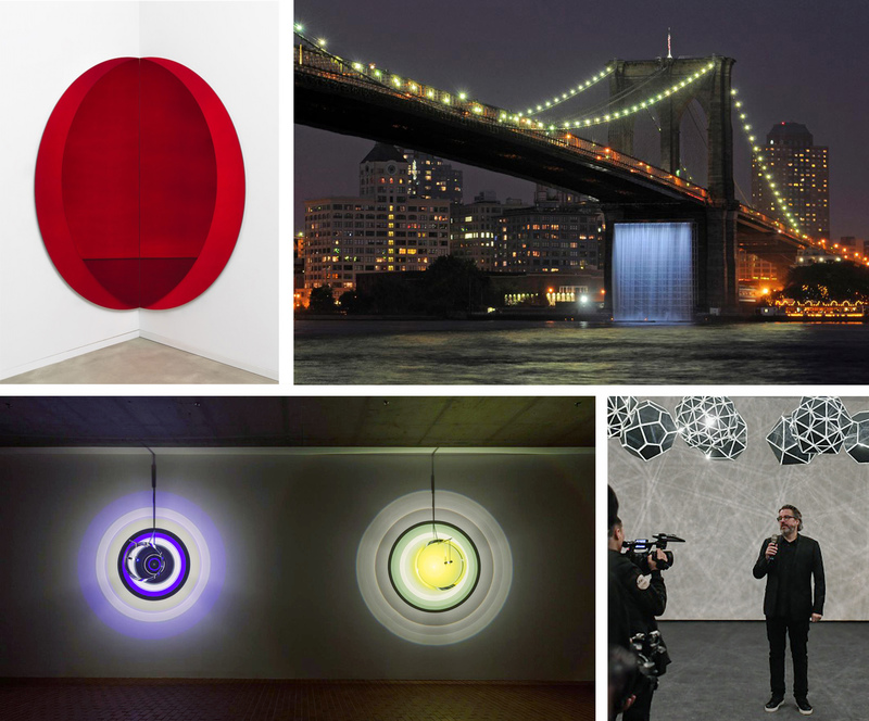 十年前在紐約港口曾出現四座巨型的人工瀑布,飛流直下的壯麗景致成為當時布魯克林大橋叫人嘆為觀止的景觀。這些膾炙人口的巨型裝置皆出自藝術家奧拉維爾·埃利亞松(Olafur Eliasson)之手。被譽稱為沉浸式視覺體驗大師的他,在操弄光影、天氣體驗裝置領域方面為代表。擅長以自然景觀為創作核心,運用人工擬造的裝置重現自然元素,營造實際感受的氛圍。像是他使用光線暈影與鏡面折射原理,定格落日晚霞的醉心時刻(The Weather Project, 2003.);或是在公共空間架起巨型瀑布(The New York City Waterfalls, 2008),擬造自然現象中的壯闊,提醒那些汲汲營營為生活奔波的人們,生活中的力與美無所不在。