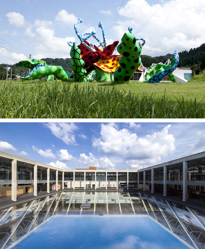 自2000年起,策展人北川富朗(Fram Kitagawa)便邀請多國的藝術家與建築師,在這片擁有大片丘陵梯田、蜿蜒小路、城鎮、村落的美麗地方進行創作與建築,與有關當局協力整合在地的資源並發展,以期能振興這個人口日漸老化與衰落的鄉里。日本代表性建築師原廣司(Hiroshi Hara)也跨刀設計了「越後妻有里山現代美術館」(KINARE),在這棟位於十日町站附近的正方建築體的中央保留一個偌大的中庭空間,展現了「屋中屋」的概念。