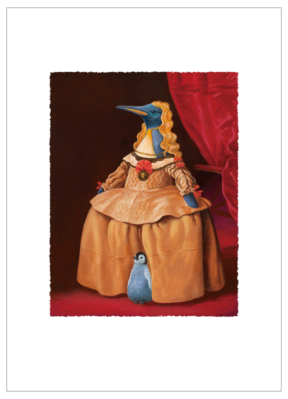 《企鵝公主》改編自委拉斯貴茲的《穿白衣的瑪格麗特公主》。詹喻帆從5歲公主蓬鬆、立體的洋裝上聯想到國王企鵝保護企鵝的舉動,因此將此畫轉化成小企鵝在遇寒時躲在父母腳邊的模樣,給予了作品不一樣的意義。詹喻帆於1983年生於台北,於2002年以及2006年先後畢業於台灣藝術大學美術系以及台灣師範大學美術系研究所。他擅長運用古典技法營造氛圍,在繪畫中重新安排真實世界裡的人、事、物,築構自成一格的敘事風格。