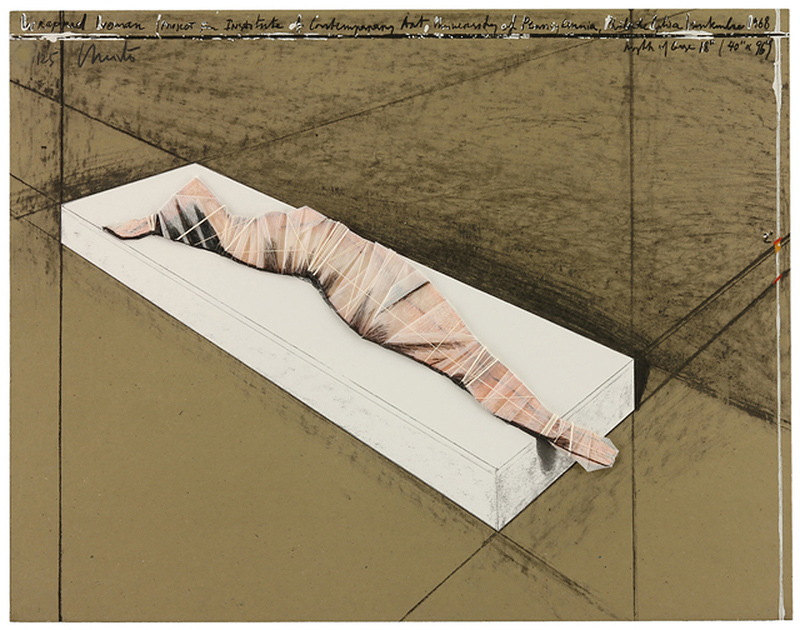 《Wrapped Woman》作品是1968年在費城賓夕法尼亞大學當代藝術學院展示活體雕塑的作品草圖。藉由包裹女性的身體來刺激觀眾正視脅迫與虐待等社會議題。