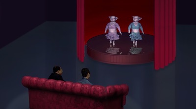 藝術家李小鏡於是在2018年決定跟他在紐約的3D團隊一起製作一件高寫實、高解析度動畫短片。短片內容是兩隻穿著舞裙的小豬(原造型:2006年《成果》系列的 ”Dancers”) 在舞台上借3D動畫的功能大跳“Shuffle”廣場舞的影片。這也是拉開李小鏡最新系列《洗》序幕的引線。