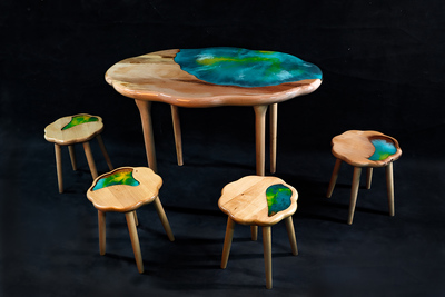 三毛櫸木、環氧樹脂,桌子:90x60x58cm、椅子28x28x30cm/piece