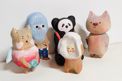 柳安木、梧桐木、黃檜、壓克力顏料. a.慾望:吃:12x7x22.5cm, 睡:13.5x10x22cm, 外貌:9.5x6x18.5cm, 財富:23.5x8x9.5cm, 愛:14.5x8x21cm, b.給家人的一封信:寵愛:10x11x9cm, 關愛:12x10x11cm, 幫助:12x11x12cm, 知心:12.5x10x11cm, 陪伴:12.5x10x9.5cm