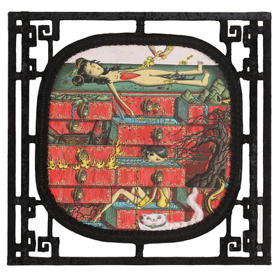 國畫顏料、墨、絹布、鐵環、蕾絲、黑色絨布、木板 76x78x2.5cm